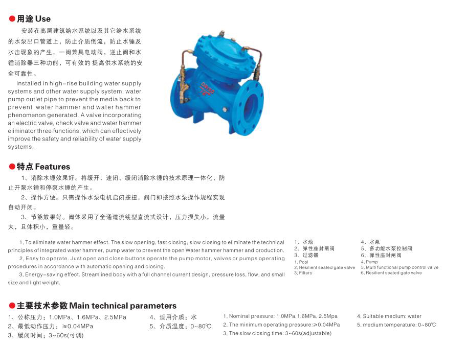 安装在高层建筑给水系统以及其它给水系统 的水泵出口管道上,防止介质倒流,防止水锤及 水击现象的产生,一阀兼具电动阀,逆止阀和水 锤消除器三种功能,可有效的提高供水系 ...