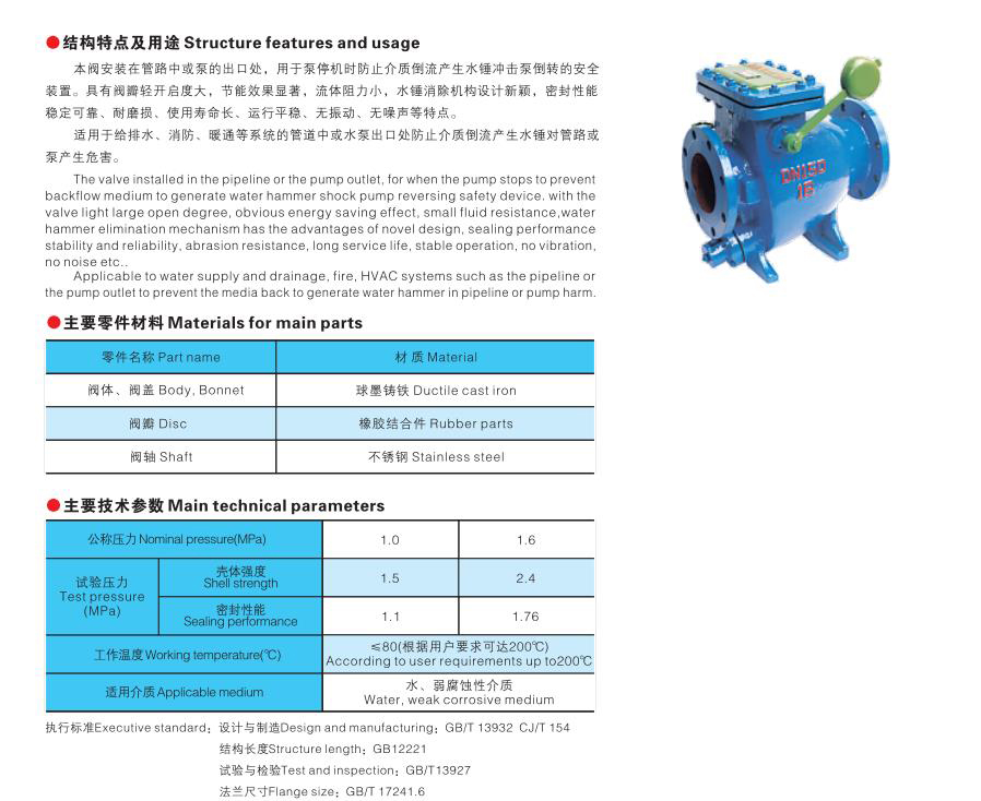 本阀安装在管路中或泵的出口处,用于泵停机时防止介质倒流产生水锤冲击泵倒转的安全 装置。具有阀瓣轻开启度大,节能效果显著,流体阻力小,水锤消除机构设计新颖,密封性能 ...