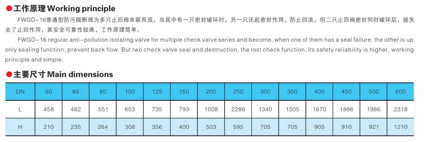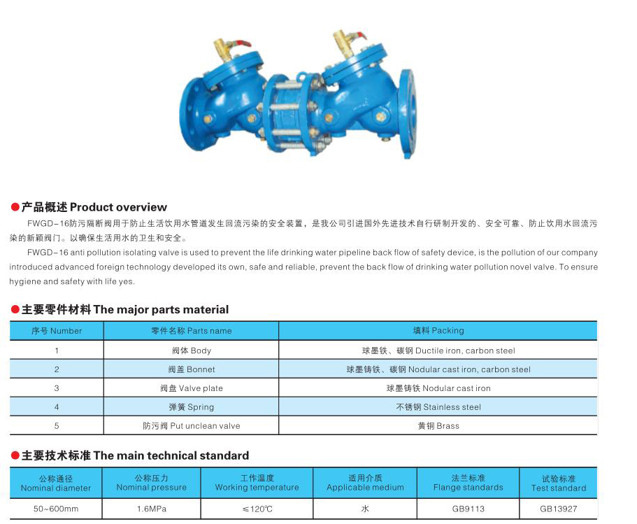 FWGD- 16防污隔断阀用于防止生活饮用水管道发生回流污染的安全装置,是我公司引进国外先进技术自行研制开发的、安全可靠、防止饮用水回流污 染的新颖阀门。以确保生活用水的卫生 ...