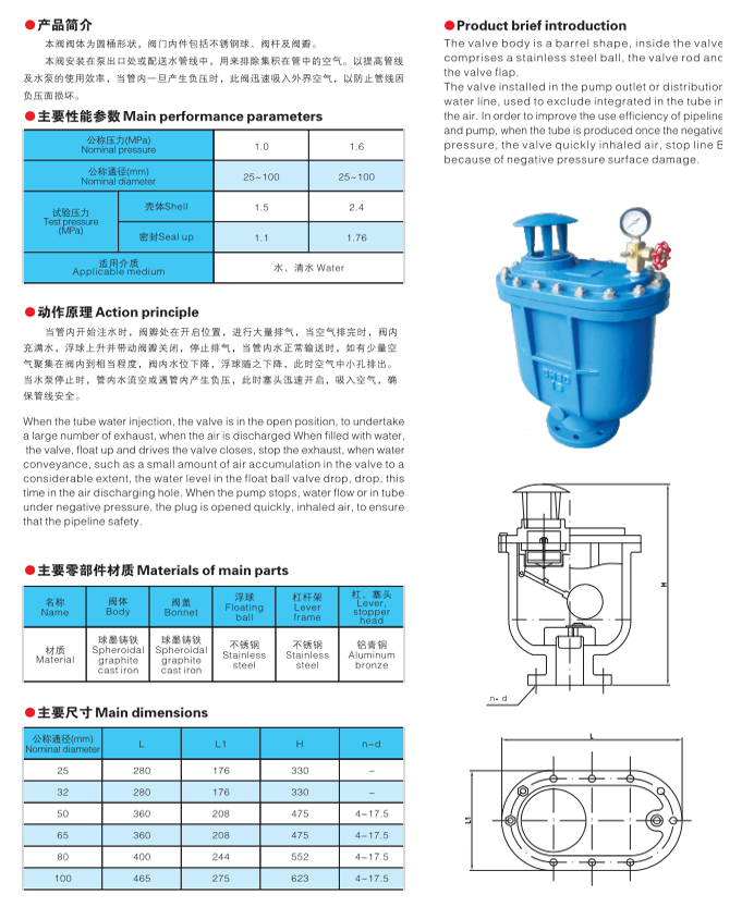 本阀阀体为圆桶形状,阀门内件包括不锈钢球、阀杆及阀瓣。 本阀安装在泵出口处或配送水管线中,用来排除集积在管中的空气。以提高管线 及水泵的使用效率,当管内一旦产生负压 ...